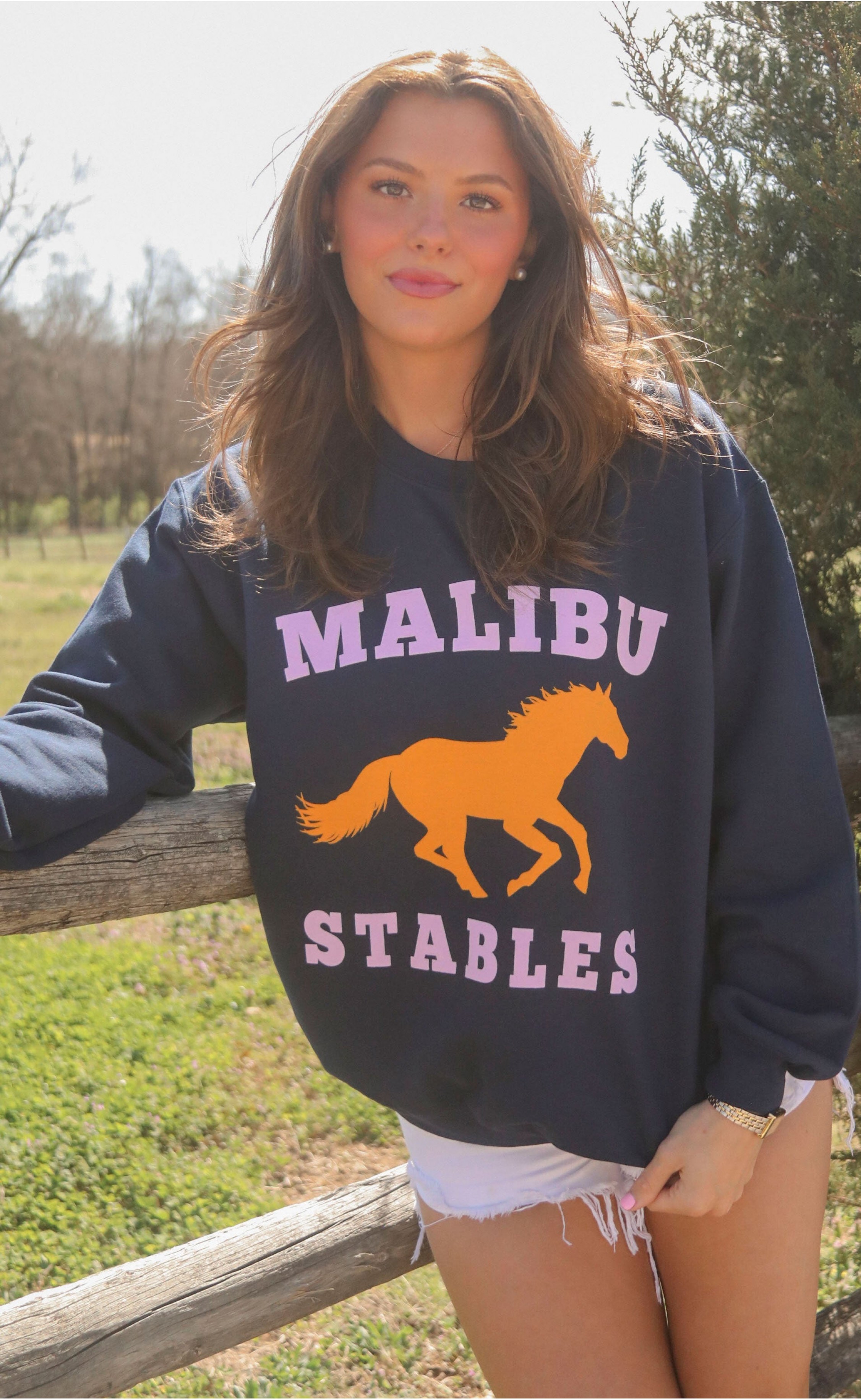 Malibu Barbie goes country with this fun navy sweatshirt! Featuring a vibrant pink and orange graphic that celebrates the girliest stable in Malibu, this cozy sweatshirt is perfect for adding a playful pop of color to your casual look. Whether you want an oversized vibe or a more fitted feel, it’s got you covered.