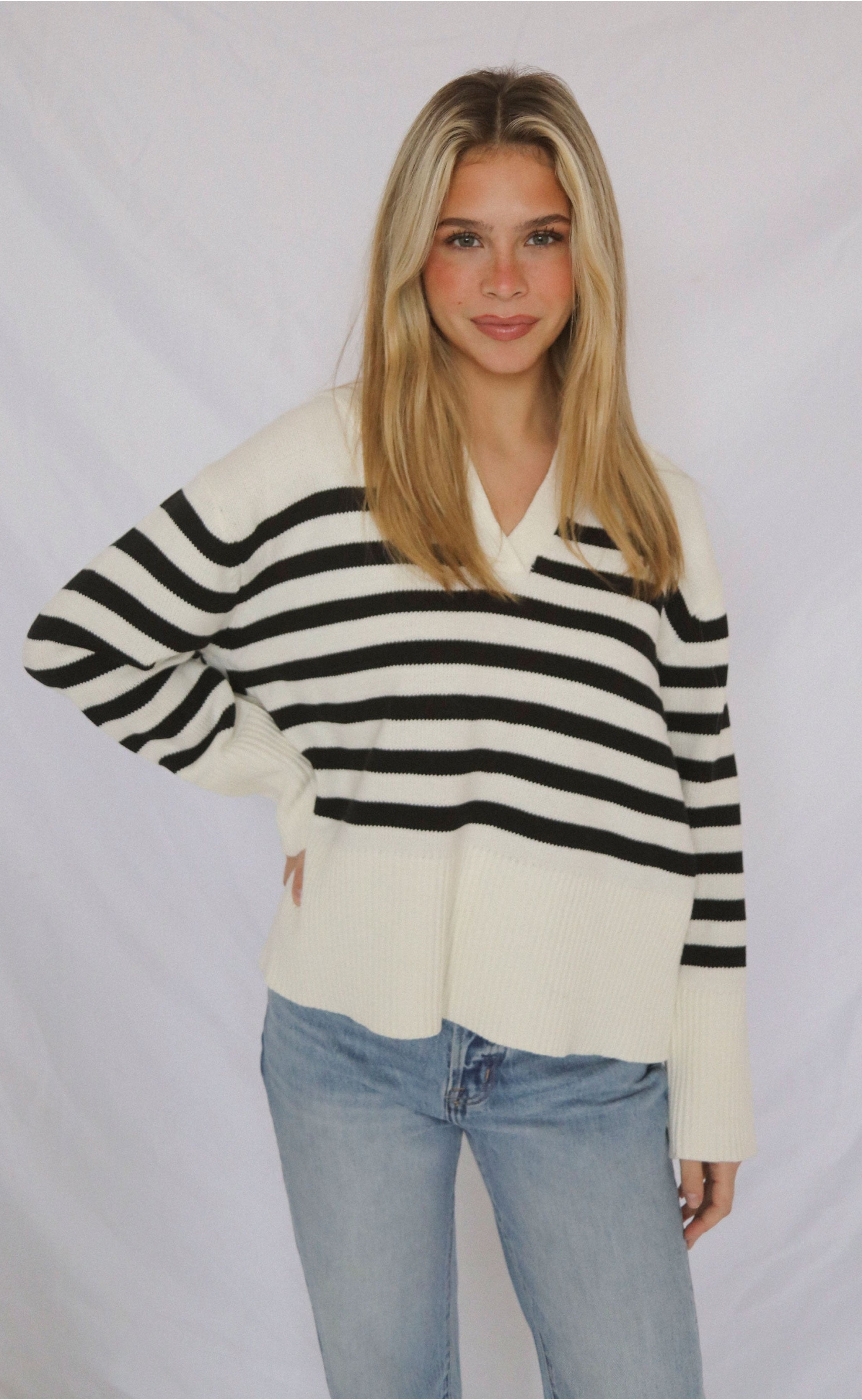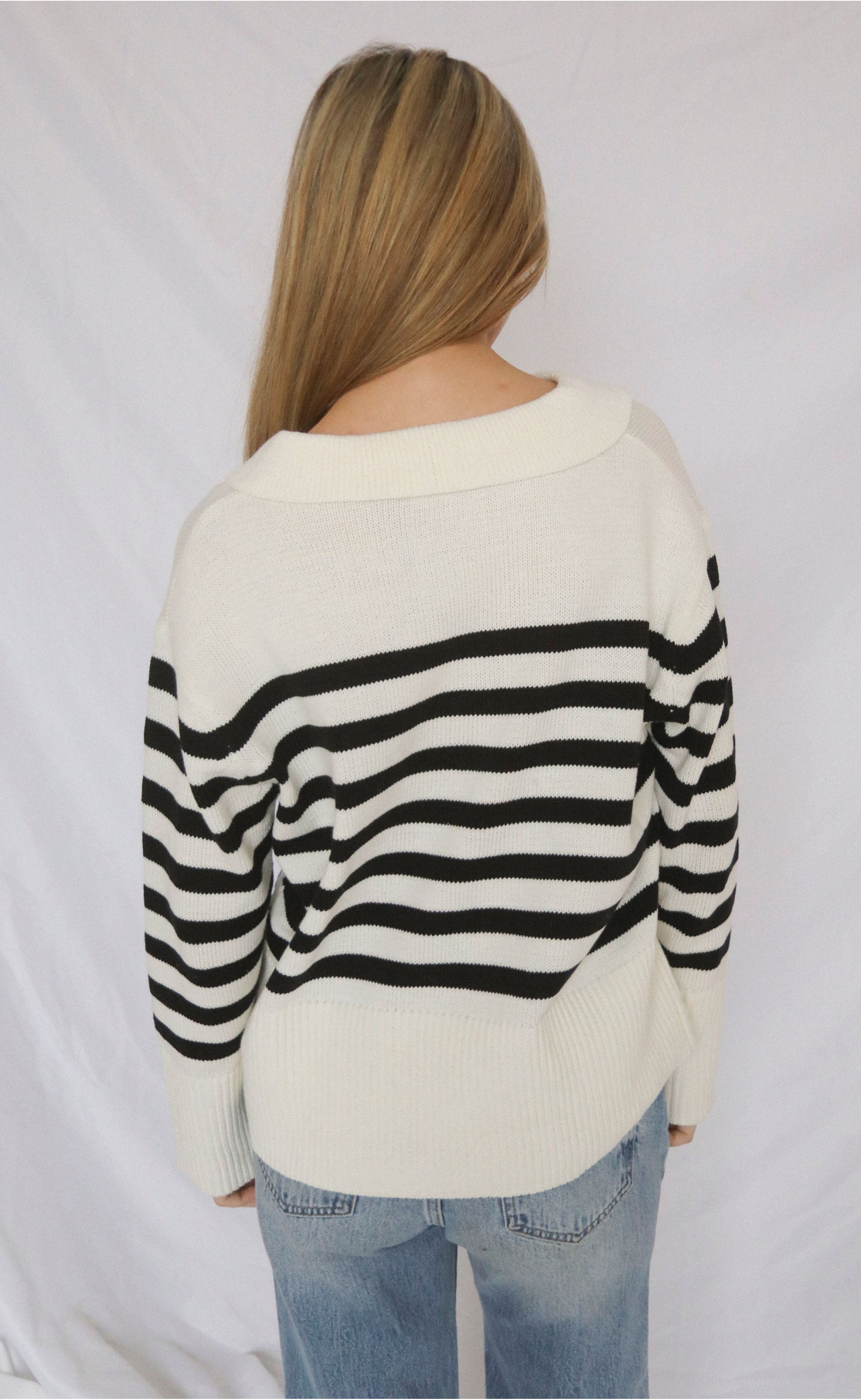 Meet your new go-to sweater: the Walk in the Park Sweater is a classic black and white striped knit that blends polish with comfort. Featuring a collared neckline and a relaxed fit, this timeless piece can be dressed up or down with ease. Whether you're heading into the office, grabbing coffee with friends, or styling it for a night out, this sweater delivers versatile, effortless style.