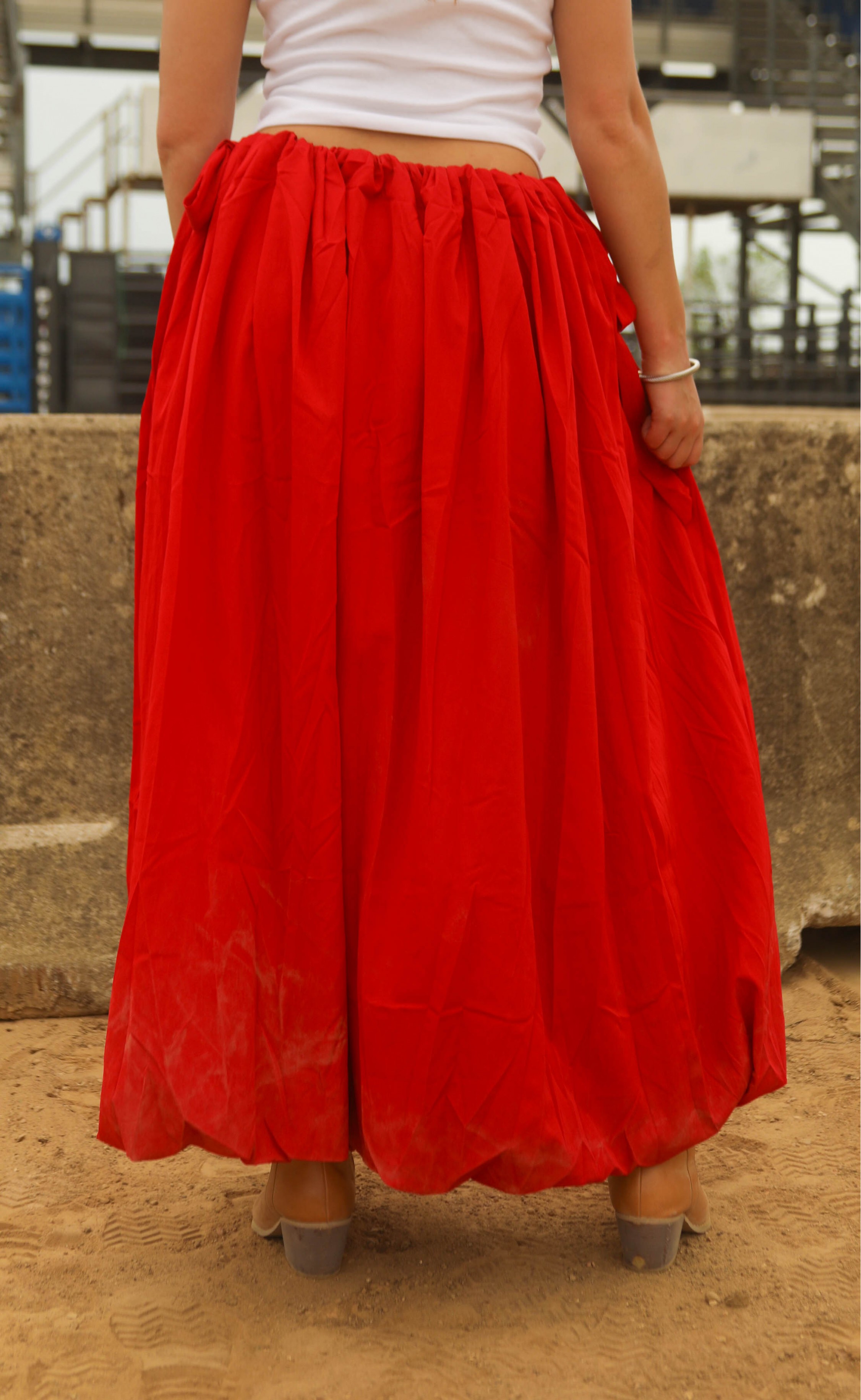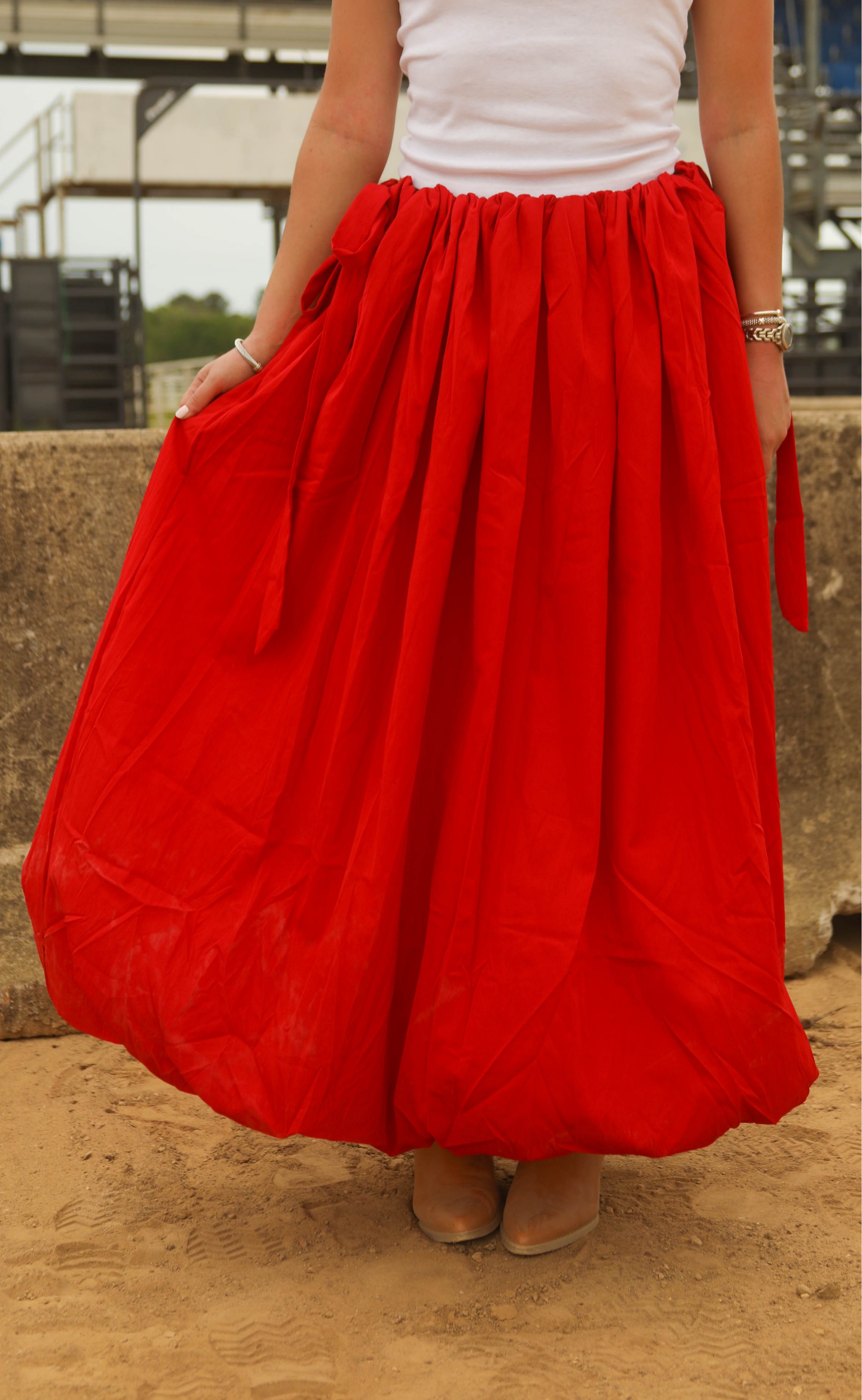 She’s red hot and ready to turn heads! The Firecracker Flare Maxi Skirt features a vibrant cherry red hue and a flattering bubble hem that adds playful volume and movement. Designed with an elastic, adjustable waistband complete with side ties for a custom fit, this skirt offers comfort and style in one. Bonus: wear it as a strapless dress for a fun and flirty twist!