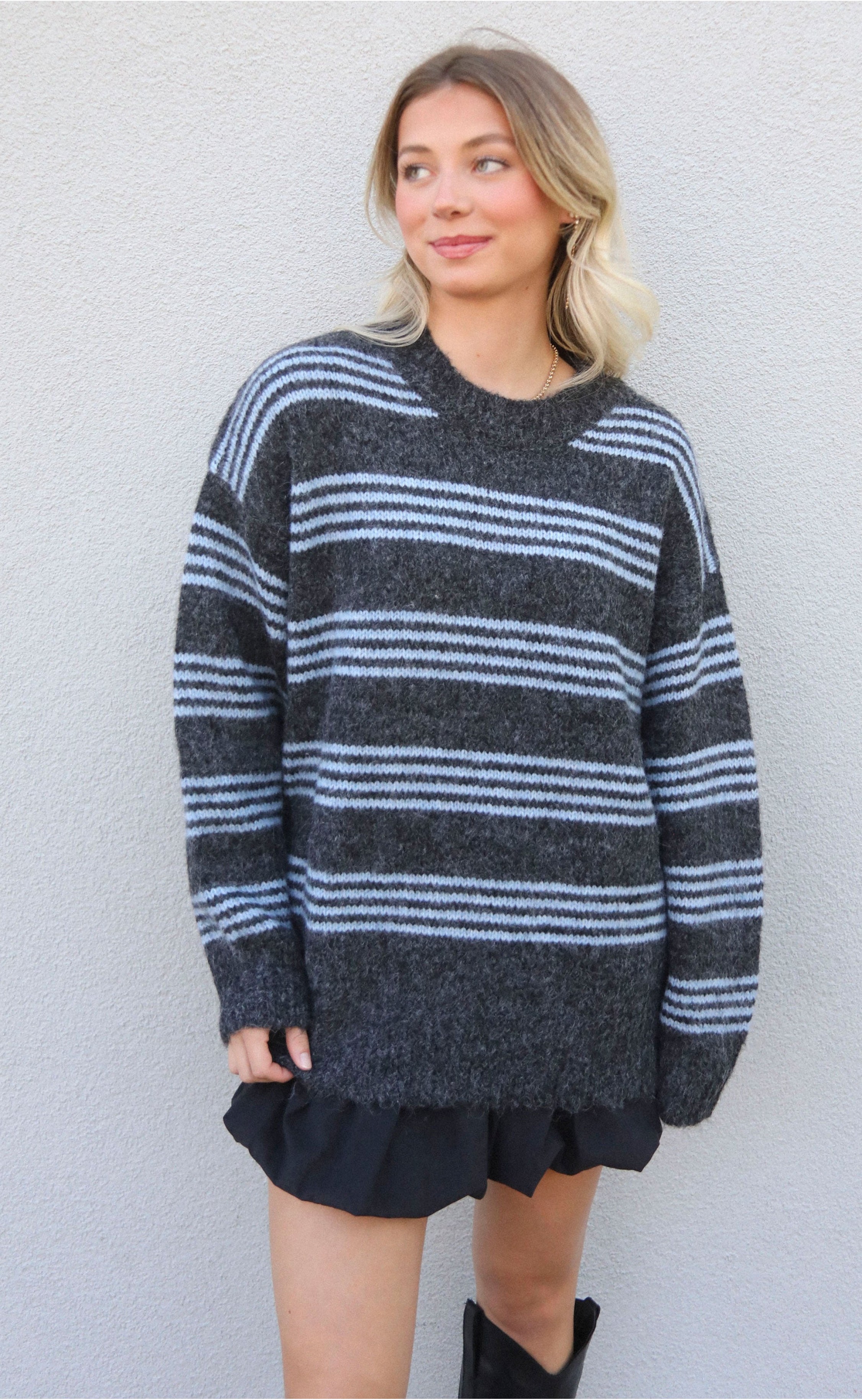 For the gal who loves a little shoulder peek, the Hold Me Close Top is your perfect match. This off-white sweater is adorned with cozy brown and beige stripes, featuring a fitted bodice and long sleeves. The standout detail? An oversized fold-over neckline that gracefully drapes off one shoulder, adding a touch of effortless allure to your look.