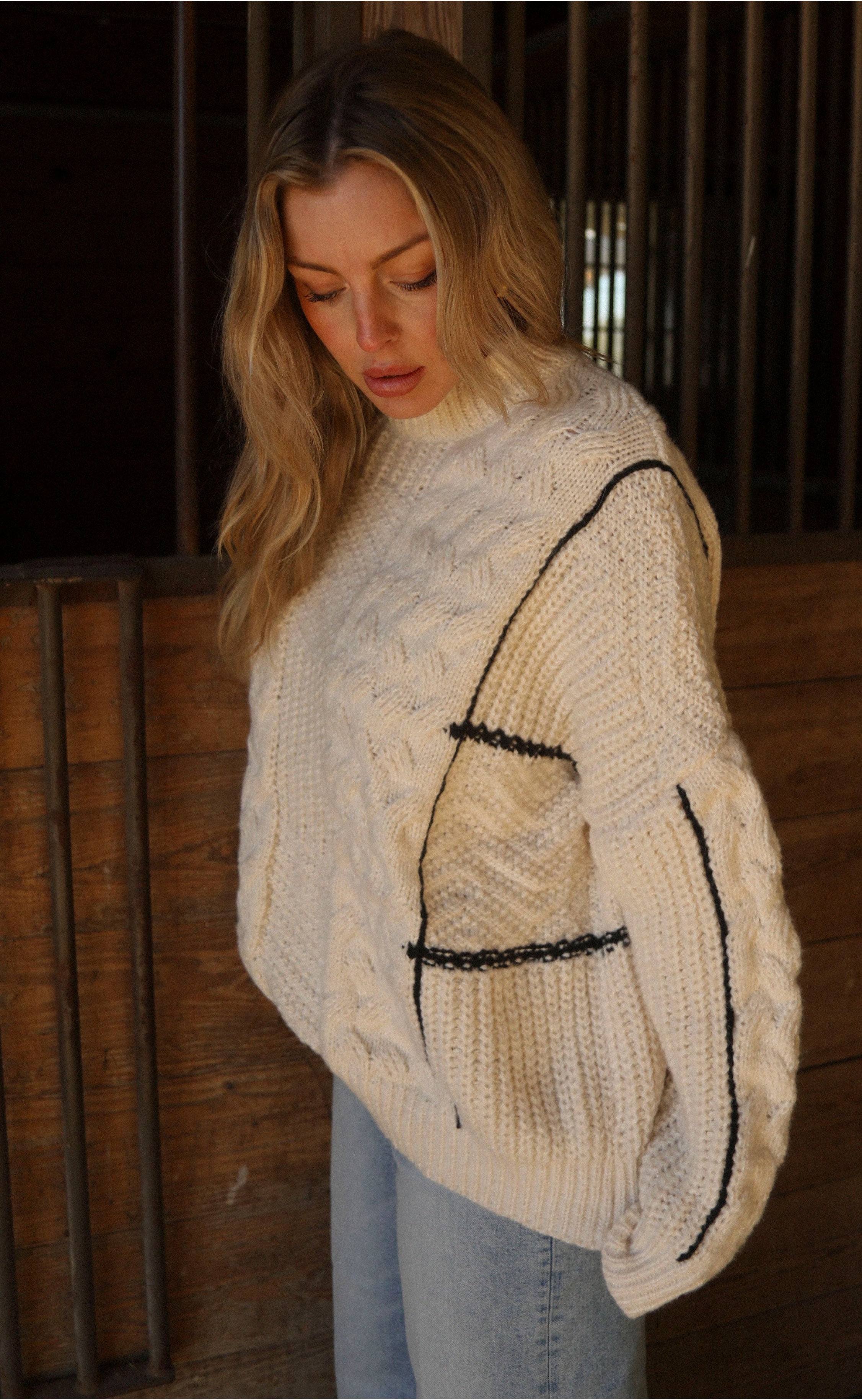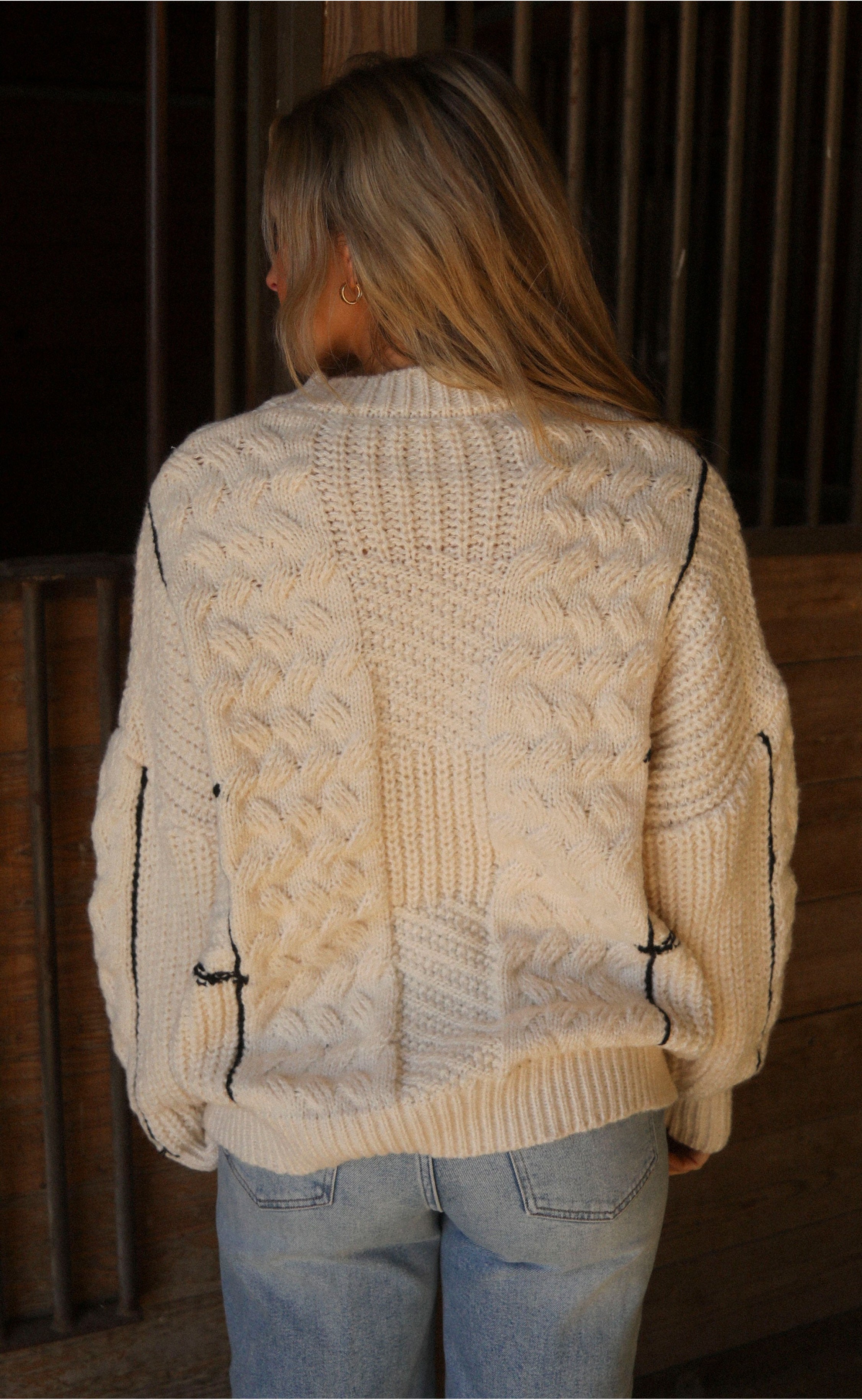 Snuggle up in style with the Look After You Sweater, a cozy, chunky cream-colored crewneck that’s as unique as it is timeless. Featuring striking black piping details woven throughout and contrasting knit patterns, this sweater is full of personality and texture. Its artful design makes it the perfect statement piece for your fall and winter wardrobe.