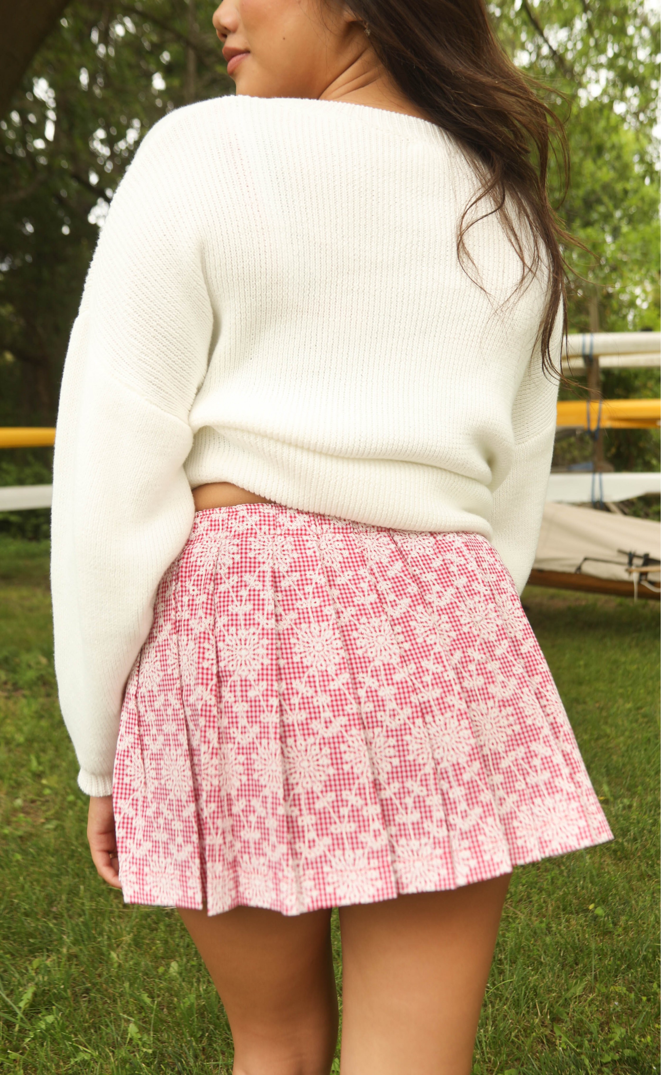 Let freedom ring with this adorable red pleated mini skirt! The Freedom Frills Mini Skirt features a charming red gingham pattern adorned with delicate floral embroidery all over. An elastic waistband ensures comfort and a perfect fit. Pair it with a graphic tee or a simple white tank for a fun, festive patriotic look.