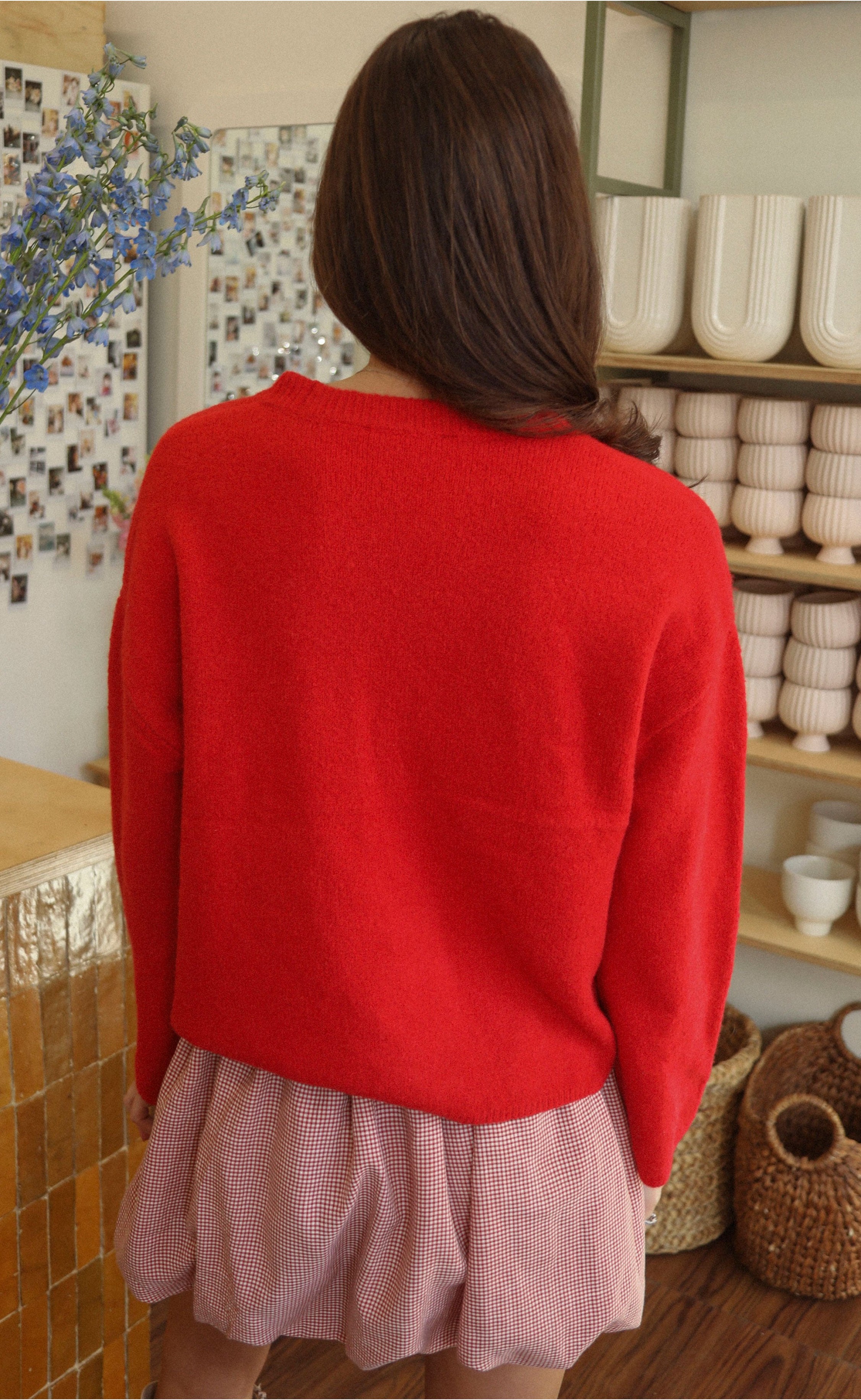 The Bowie Sweater is your new holiday hero—a stunning red crewneck crafted from a medium-weight knit that perfectly balances warmth and breathability. Featuring delicate, thin ribbed trim along the collar, hem, and cuffs, this sweater offers subtle texture and refined detailing that elevate its classic silhouette.