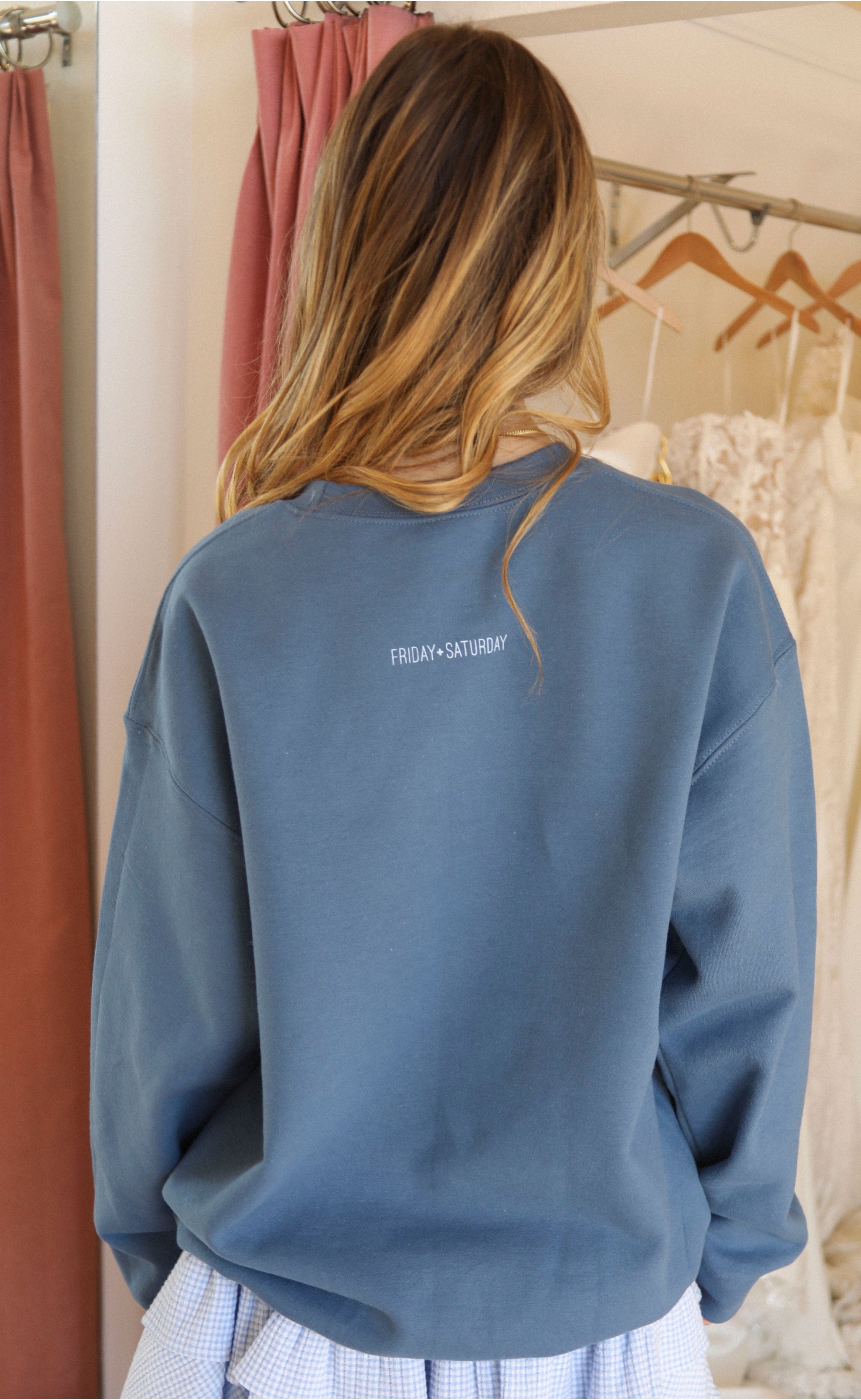 Signed, sealed, delivered — this sweatshirt says it all! Perfect for the hopeless romantic, bride-to-be, or newlywed, this indigo blue crewneck sweatshirt brings all the love vibes. The entire front is adorned with a delicate light blue graphic featuring a beautifully tied ribbon bow, giving it a sweet and charming look that’s both playful and heartfelt.