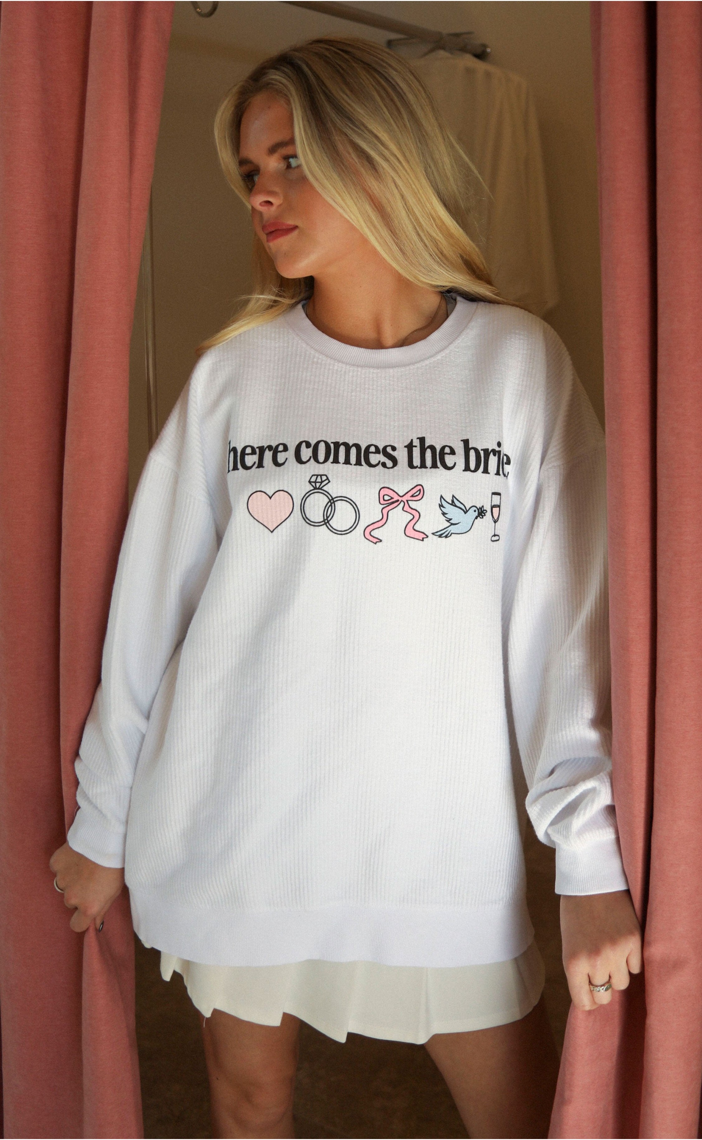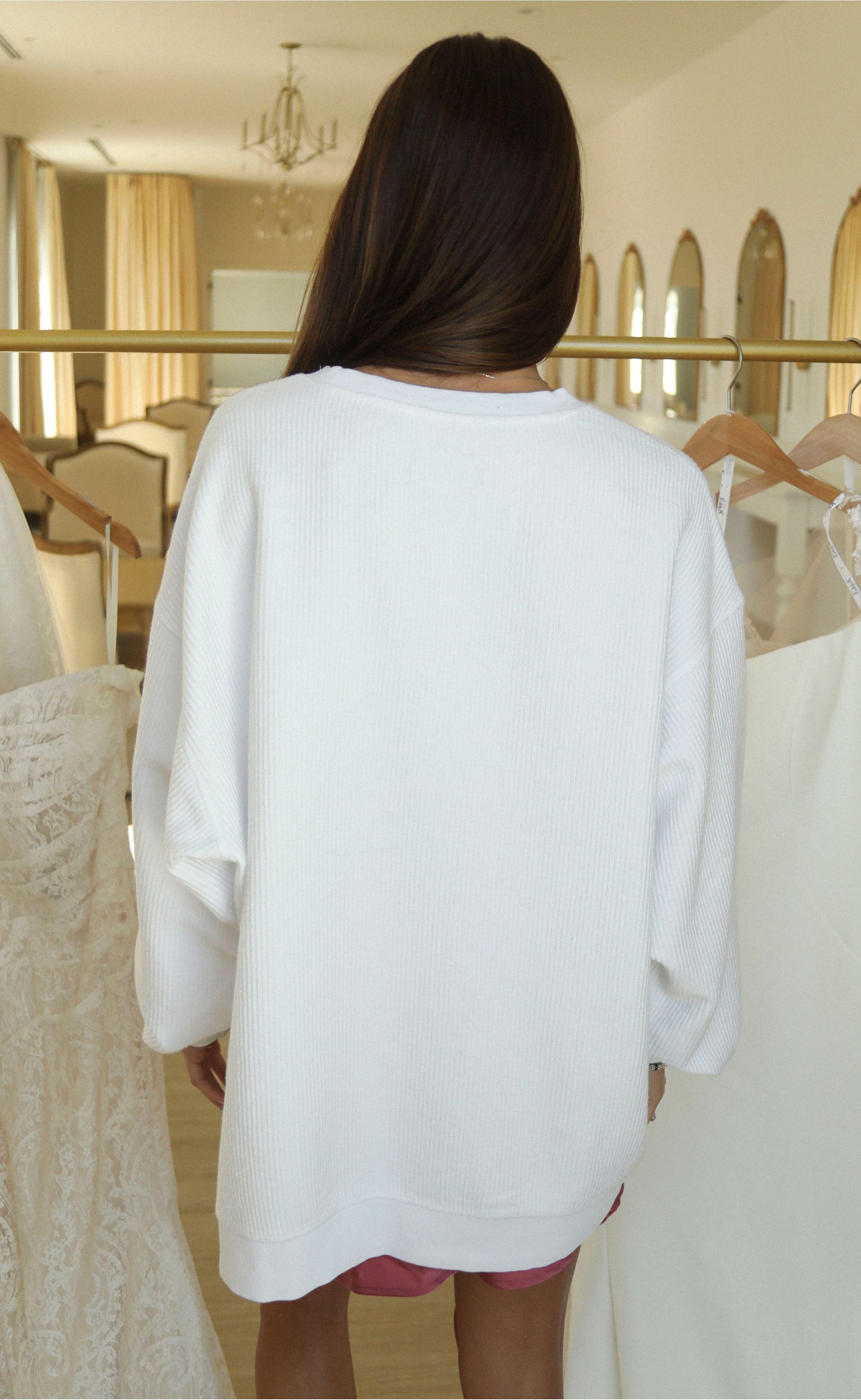 Made with a soft, cozy corded fabric, this sweatshirt is as comfortable as it is cute, perfect for those pre-wedding events like bridal showers, bachelorette parties, or getting ready on the wedding morning. The oversized fit adds an effortlessly relaxed vibe, letting you feel cozy while looking stylish in all your wedding weekend photos.