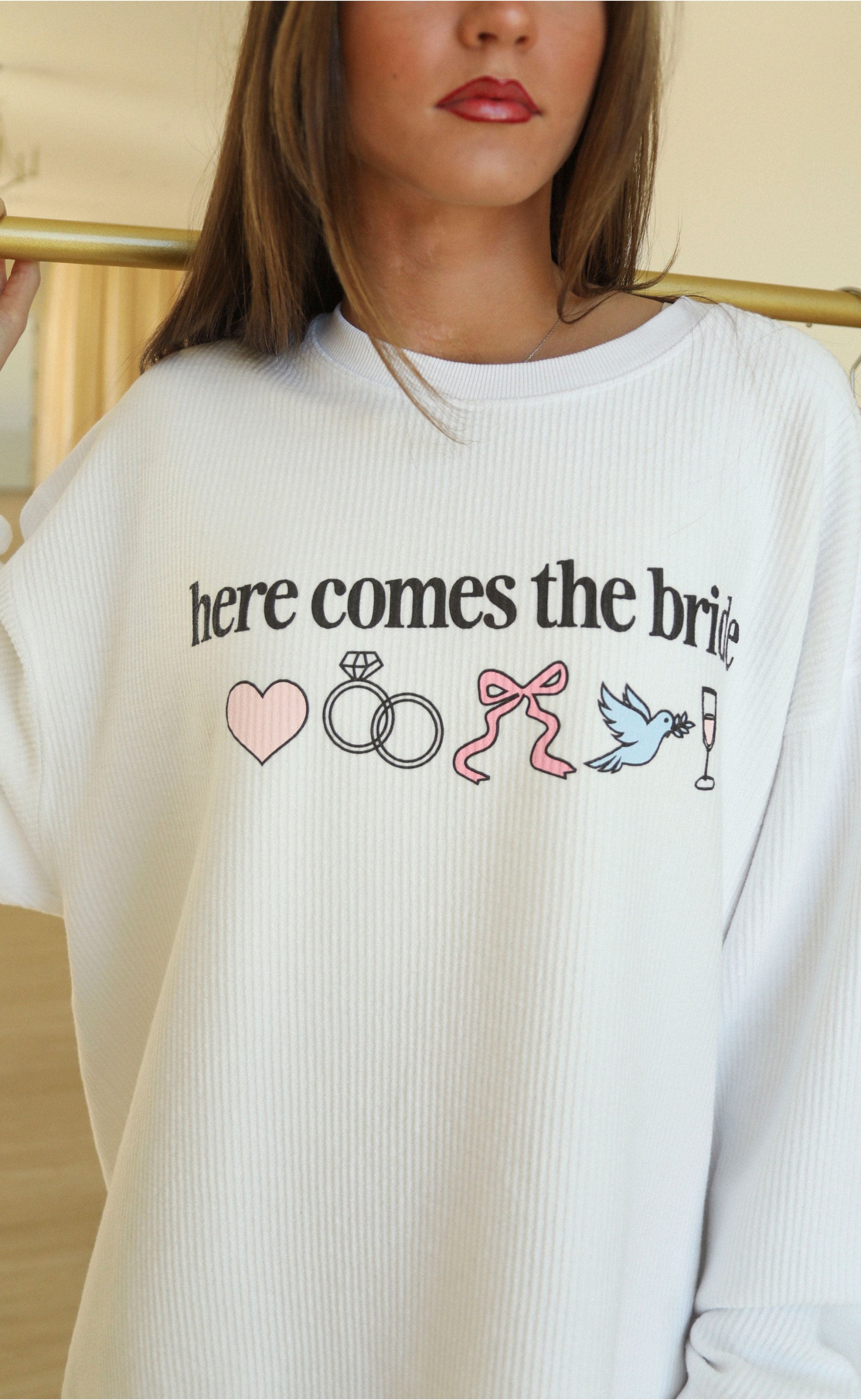 Cue the Bridal Chorus and get ready to celebrate in style with this charming white corded crewneck sweatshirt — a perfect piece for brides-to-be and their wedding squads! Designed with a minimalistic yet heartfelt aesthetic, this sweatshirt features a delicate lowercase black script that reads “here comes the bride,” elegantly underlined for a subtle but striking detail. Surrounding the phrase are sweet, symbolic illustrations including a lovers’ heart, intertwined wedding rings, a dainty bow, a peaceful dove, and a celebratory glass of champagne — all coming together to capture the excitement and romance of the big day.