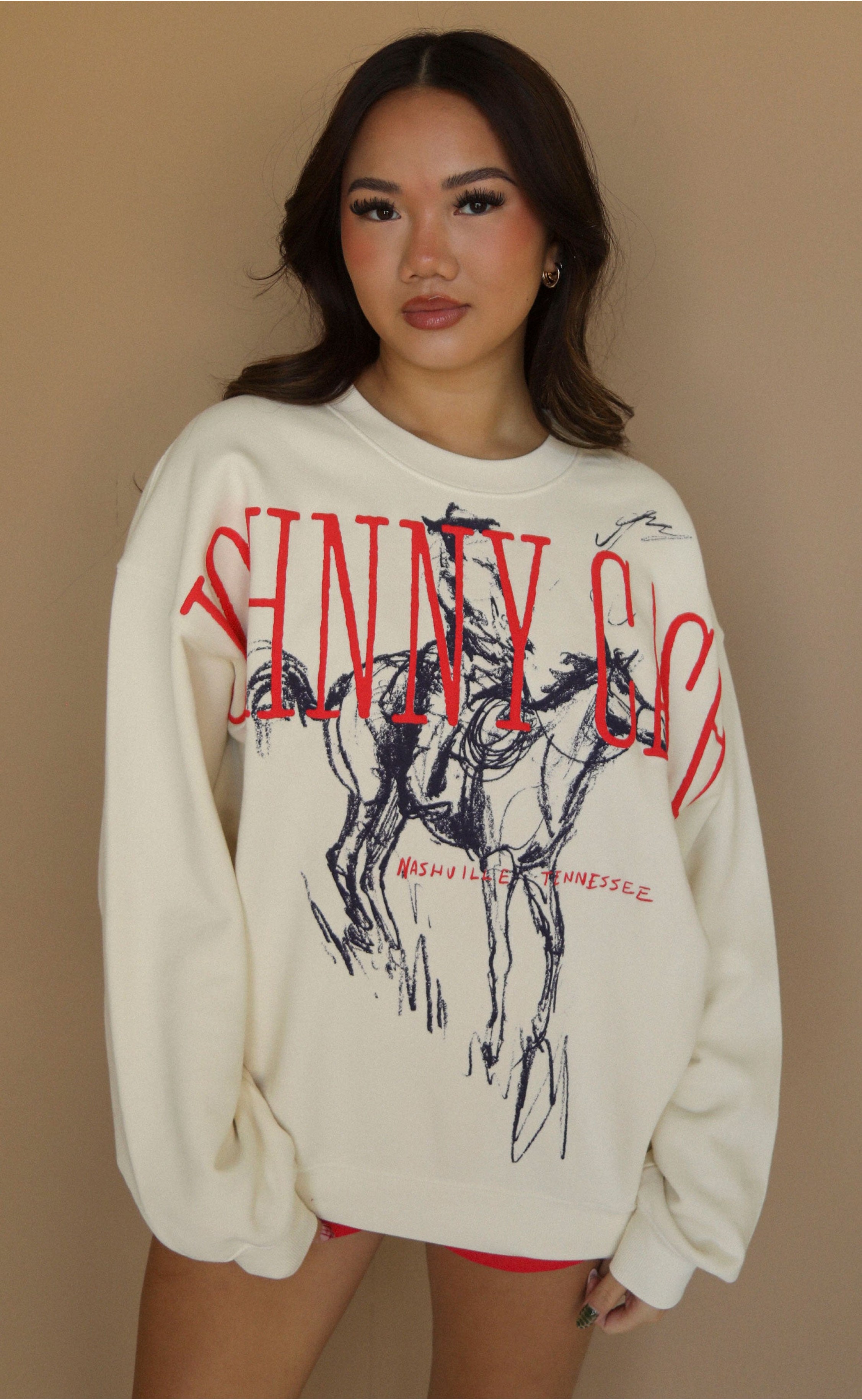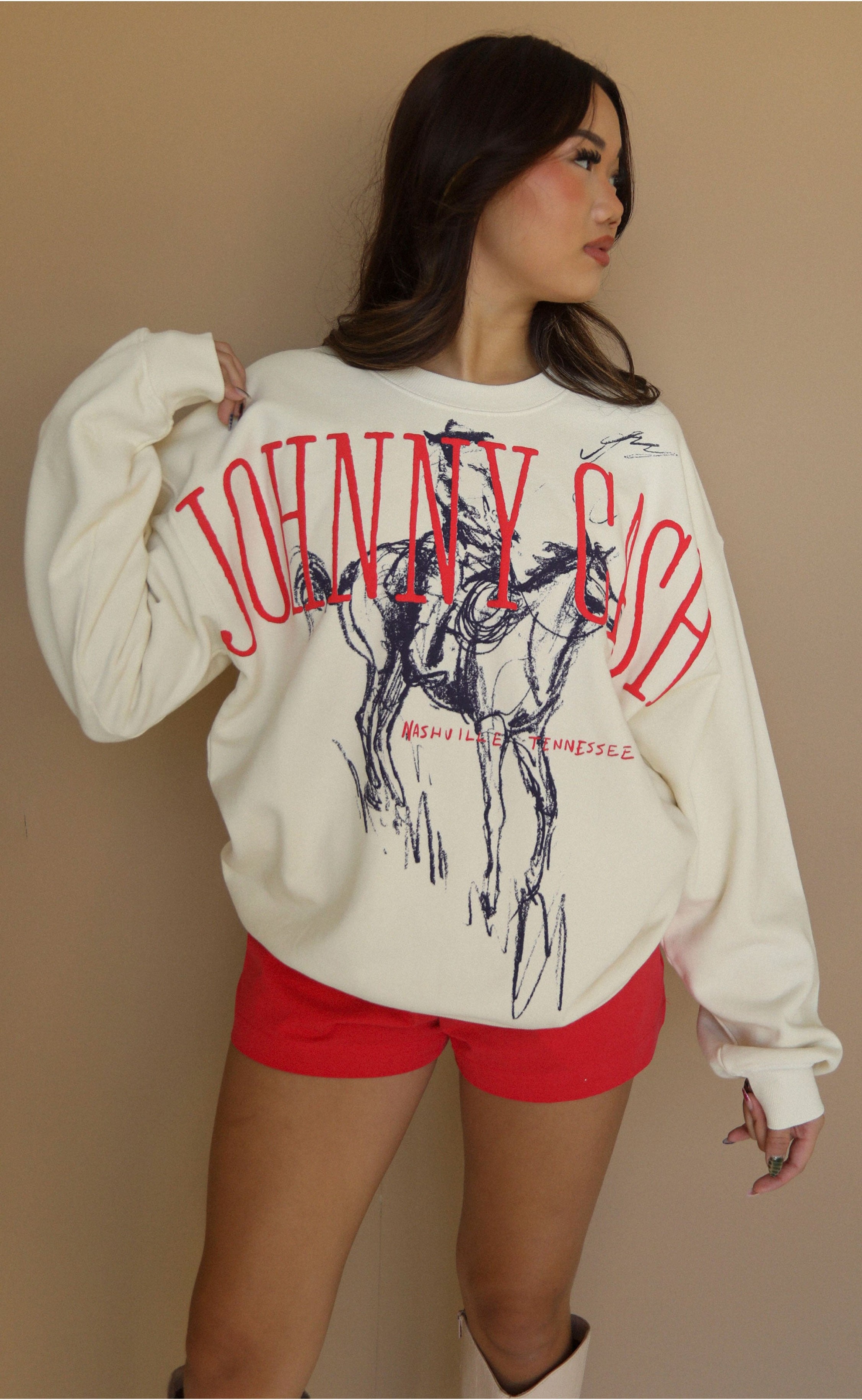 Celebrate the legendary country icon with this oversized sweatshirt featuring a striking sketched graphic of Johnny Cash and his horse. The design highlights Cash’s name in bold print that extends over the seams for a unique, edgy look. Perfect for fans who want to channel that classic country vibe with a modern twist.