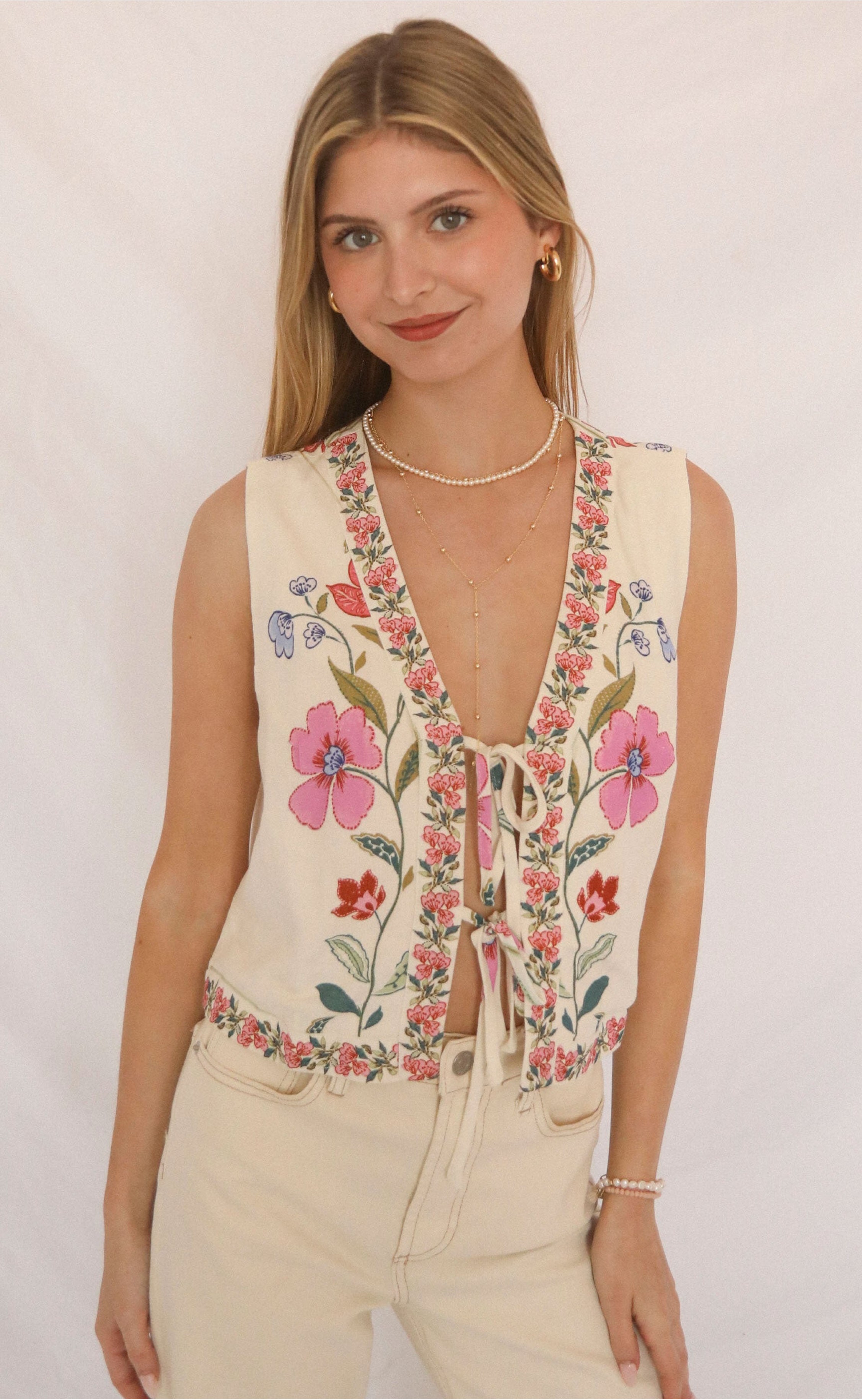 The Garden Party Tank is a beautifully crafted off-white top that exudes effortless boho charm. Designed with delicate floral embroidery in a vibrant mix of colors, this tank adds a touch of romantic femininity to any warm-weather wardrobe. The lightweight fabric—a soft blend of 85% rayon and 15% linen—ensures breathable comfort, making it perfect for sunny days, garden brunches, or casual outings.