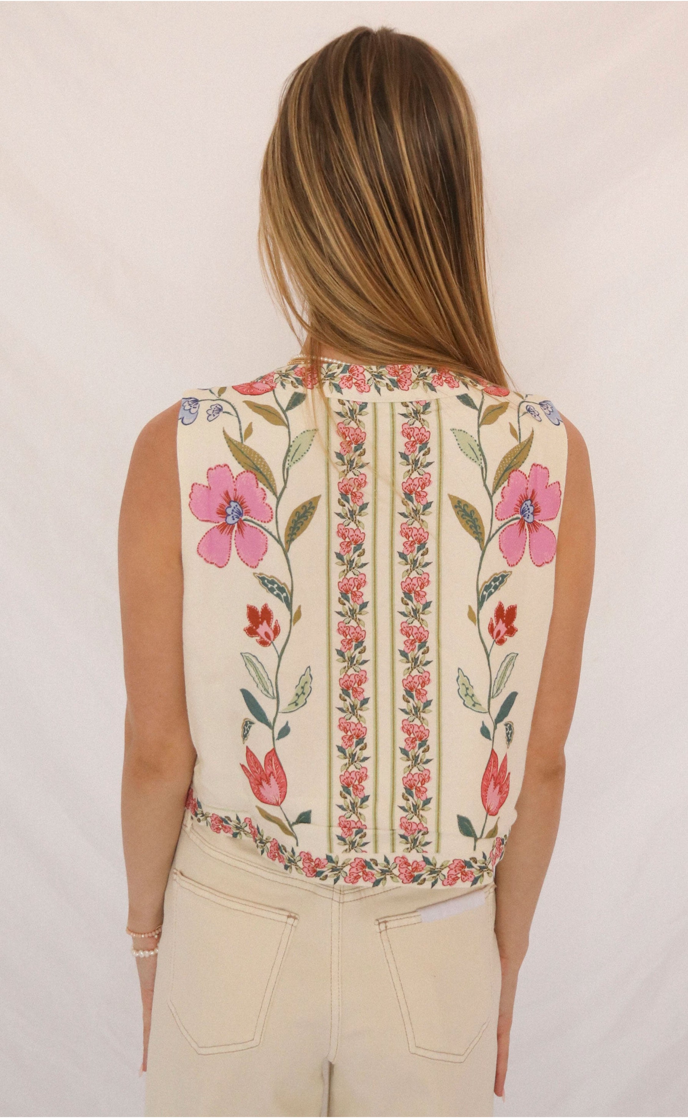 Intricate Floral Embroidery: Handcrafted detailing in a mix of floral hues adds a playful yet elegant touch, making this top a standout piece.