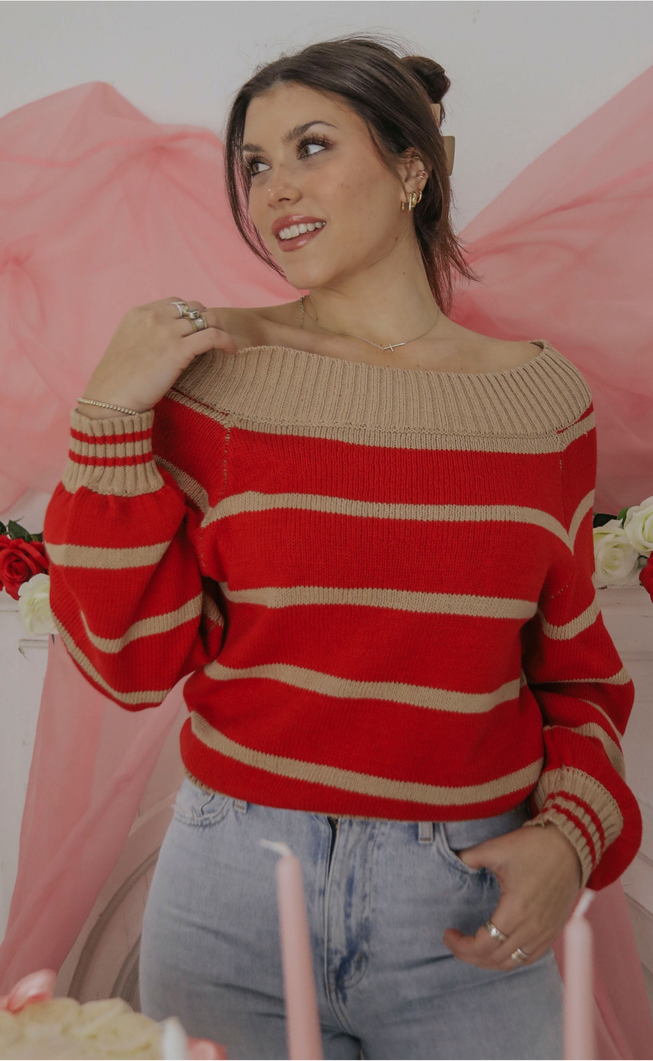 Brighten up your wardrobe with the Think of Me Sweater, a pretty and playful bright red knit featuring soft tan stripes and a flattering boatneck neckline. This cozy yet chic sweater is perfect for layering or wearing on its own, and it pairs beautifully with a mini skirt or denim and heels — making it an ideal choice for a stylish Valentine’s Day date or any occasion you want to feel special.